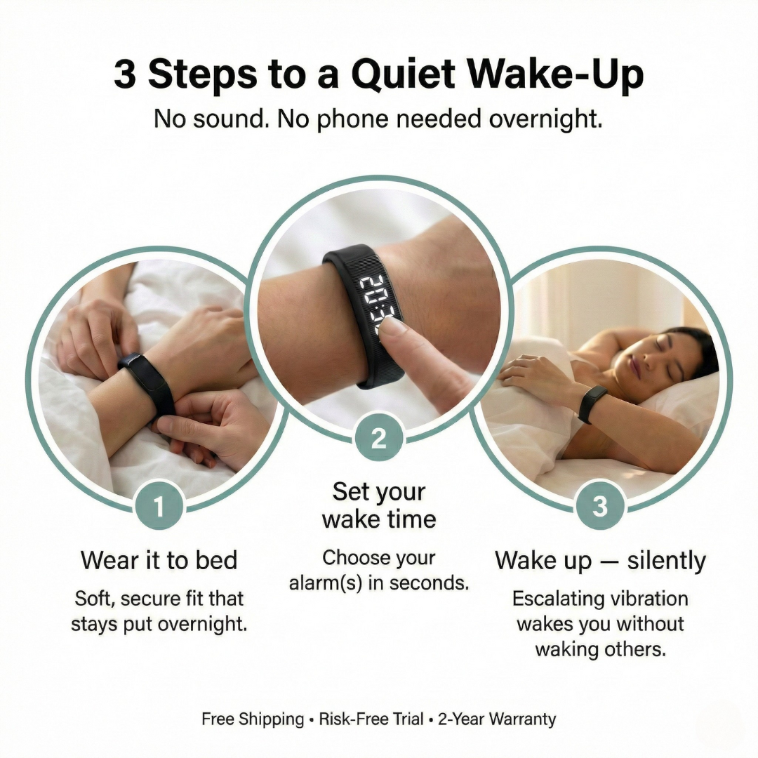 Smart Alarm uses an escalating vibration pattern that starts gentle and builds stronger on your wrist until you are awake. Unlike a single buzz that is easy to ignore, the increasing intensity is designed to cut through deep sleep. And if it does not work for you, our 100-night trial means you get a full refund — no questions asked.